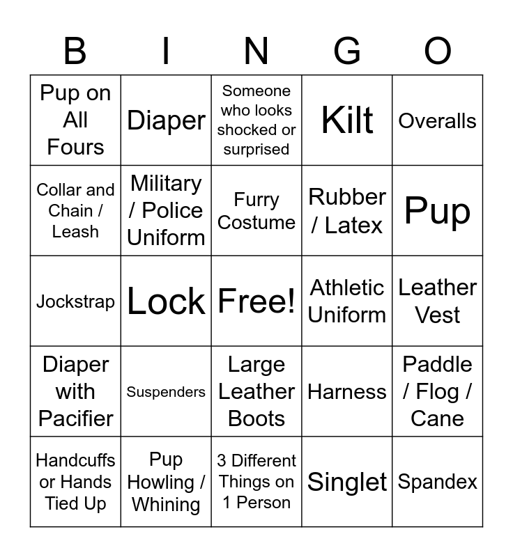 This bingo card has a free space and 24 words: Suspenders, Pup Howling / Whining, Furry Costume, Handcuffs or Hands Tied Up, Overalls, Pup on All Fours, Collar and Chain / Leash, Diaper, Athletic Uniform, Large Leather Boots, Rubber / Latex, Jockstrap, Harness, Paddle / Flog / Cane, Military / Police Uniform, Singlet, Leather Vest, Someone who looks shocked or surprised, Pup, Lock, Spandex, Diaper with Pacifier, Kilt and 3 Different Things on 1 Person.