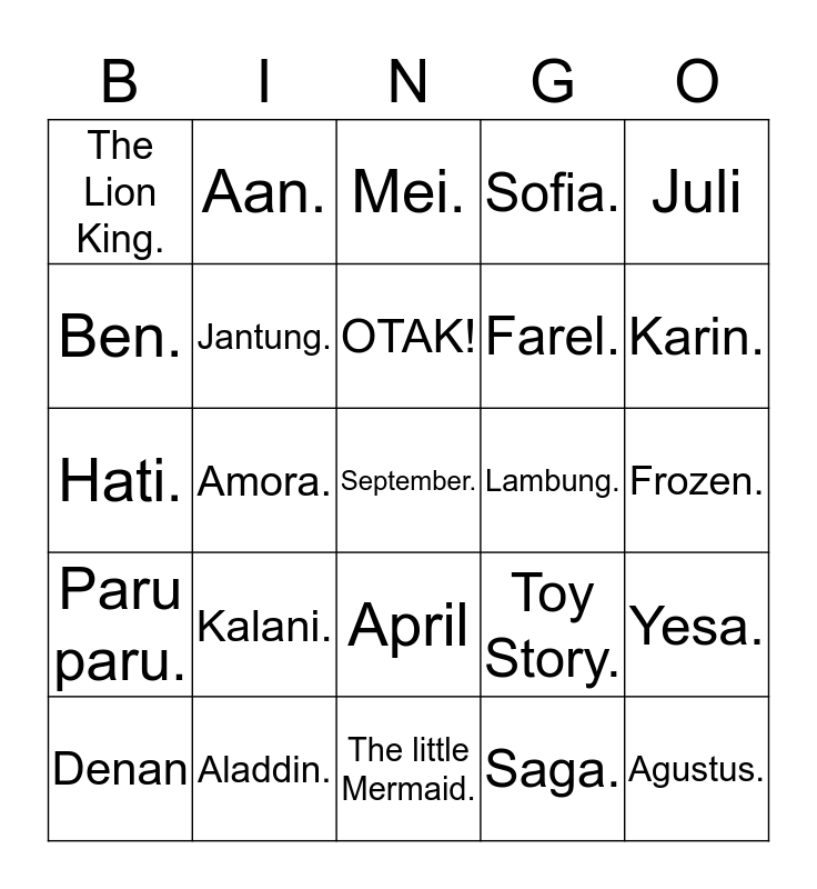 This bingo card has a free space and 24 words: Kalani., Aladdin., OTAK!, Denan, Juli, The Lion King., Ben., Aan., Lambung., April, Farel., Hati., Toy Story., Yesa., Jantung., Saga., Frozen., Mei., Karin., Amora., Agustus., Paru paru., Sofia. and The little Mermaid..