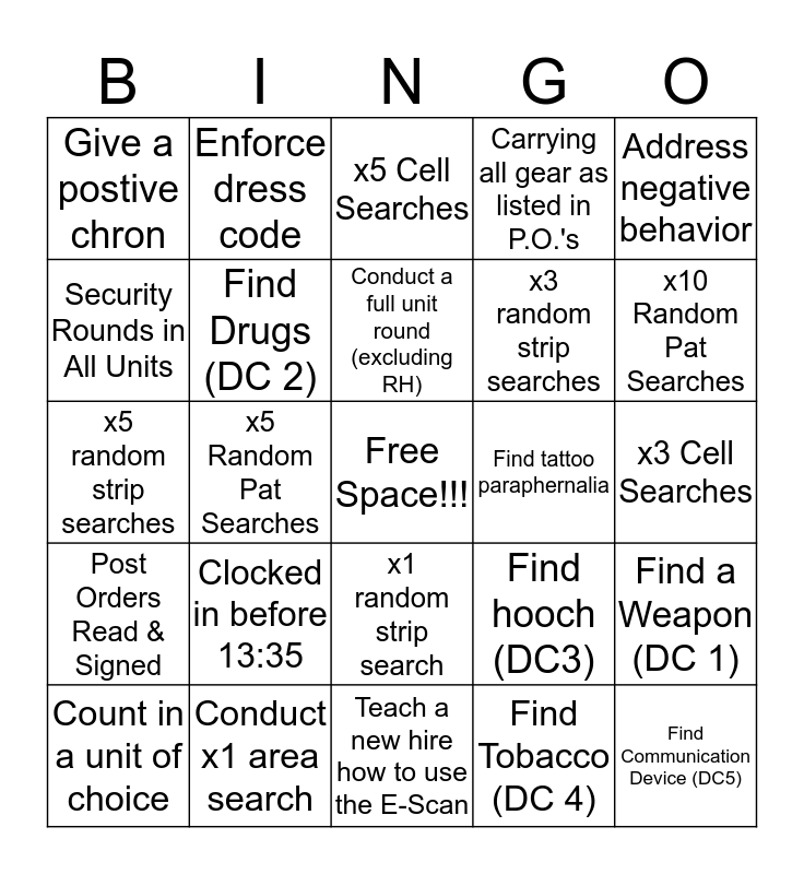 This bingo card has a free space and 24 words: Clocked in before 13:35, Conduct x1 area search, Conduct a full unit round (excluding RH), Count in a unit of choice, Address negative behavior, Give a postive chron, Security Rounds in All Units, Enforce dress code, Find tattoo paraphernalia, x1 random strip search, x3 random strip searches, x5 random strip searches, Find hooch (DC3), Find a Weapon (DC 1), Find Drugs (DC 2), Find Tobacco (DC 4), x3 Cell Searches, x5 Cell Searches, x10 Random Pat Searches, x5 Random Pat Searches, Find Communication Device (DC5), Post Orders Read & Signed, Carrying all gear as listed in P.O.'s and Teach a new hire how to use the E-Scan.
