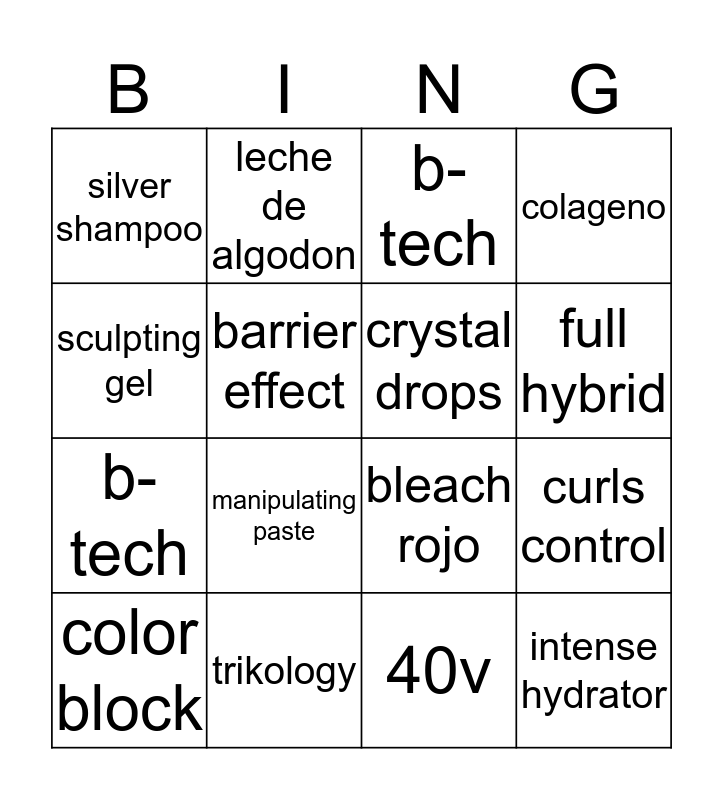 This bingo card has 25 words: Free!, easy tech, full hybrid, 1+2, sculpting gel, silver shampoo, barrier effect, leche de algodon, trikology, restructuring power, b-tech, bleach rojo, .03, 30g+60g, crystal drops, gradient tone, 40v, b-tech, manipulating paste, curls control, color block, detox preparing, intense hydrator, colageno and 99 tones.