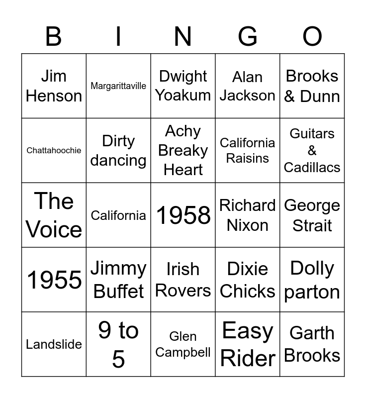 This bingo card has 35 words: Tatoo, Mark Spitz, Nadia Comenci, Dirty dancing, Irish Rovers, Alan Jackson, Chattahoochie, Billy Ray Cyrus, Achy Breaky Heart, Blake Shelton, The Voice, Brooks & Dunn, My Maria, Microsoft, Jim Henson, Richard Nixon, Easy Rider, California, 1955, 1958, Dixie Chicks, Landslide, Dolly parton, 9 to 5, Dwight Yoakum, Guitars & Cadillacs, Garth Brooks, I Heard it Through the Grapevine, California Raisins, George Strait, Amarillo By Morning, Glen Campbell, Jimmy Buffet, Margarittaville and Canucks.
