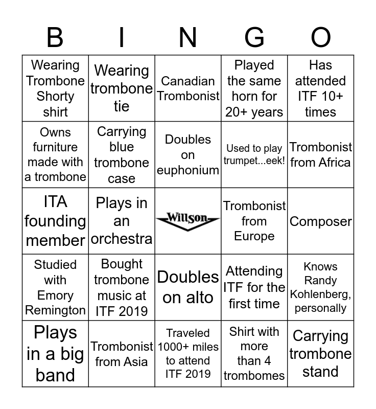 This bingo card has a free space and 57 words: ITF 2019 performer, Plays in a big band, Carrying a plunger in their case, Wearing Trombone Shorty shirt, Traveled 1000+ miles to attend ITF 2019, Plays in a jazz combo, Carrying blue trombone case, Commissioned a work for trombone, Used to play trumpet...eek!, Has recorded a solo album, Played the same horn for 20+ years, Doubles on tuba, Brought their pet to ITF 2019, Teaches middle school band, Ball State trombone student, Trombonist from South America, Has attended ITF 10+ times, Plays in an orchestra, Arranger, Carrying trombone stand, Trombonist from Europe, Plays in a funk band, Attending ITF for the first time, Canadian Trombonist, Ball State trombone student, Doubles on euphonium, Played the same horn for 20+ years, Wearing trombone socks, Trombonist from Africa, ITF 2019 performer, Has a trombone tattoo, Has a pet named after a famous brass player, Came to ITF with their mom, Commissioned a work for trombone, Composer, Owns furniture made with a trombone, Wearing trombone jewelry, ITA founding member, Plays in trombone quartet, Studied with Emory Remington, Wearing trombone tie, Doubles on alto, More than 3 mouthpieces on them, Plays in a military band, ITF Board of Directors, 75+ year old trombonist, Bought trombone music at ITF 2019, Trombonist from Asia, Trombone couple, Has attended ITF 5+ times, Female bass trombone player, Shirt with more than 4 trombomes, Conductor, Teaches high school band, Teaches trombone at a collegiate level, Knows Randy Kohlenberg, personally and Wearing shirt with trombone pun.