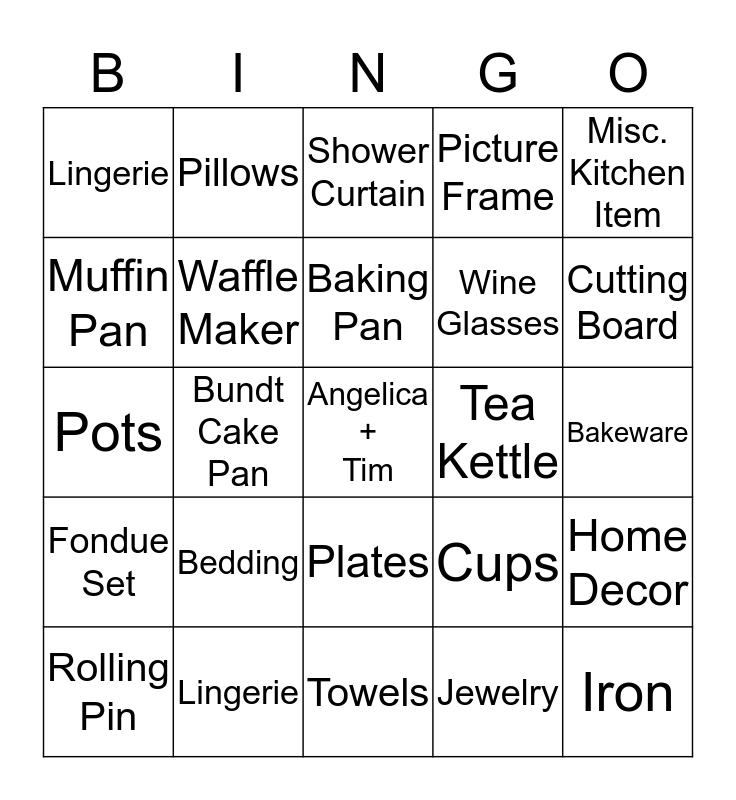 This bingo card has a free space and 46 words: Gift Card, Iron, Bowels, Towels, Bedding, Sheets, Pillows, Ironing Board, Muffin Pan, Curtains, Waffle Maker, Picture Frame, Home Decor, Cups, Utensils, Vacuum, Baking Pan, Tea Kettle, Apron, Misc. Kitchen Item, Bundt Cake Pan, Jewelry, Lingerie, Wine Glasses, Champagne Flutes, Cutting Board, Rolling Pin, Juicer, Plates, Fondue Set, Blanket, Tupperware, Muffin Pan, Cups, Mixer, Lingerie, Bakeware, S & P Shakers, Blender, Placemats, Rolling Pin, Shower Curtain, Pots, Pans, Bakeware and Free.
