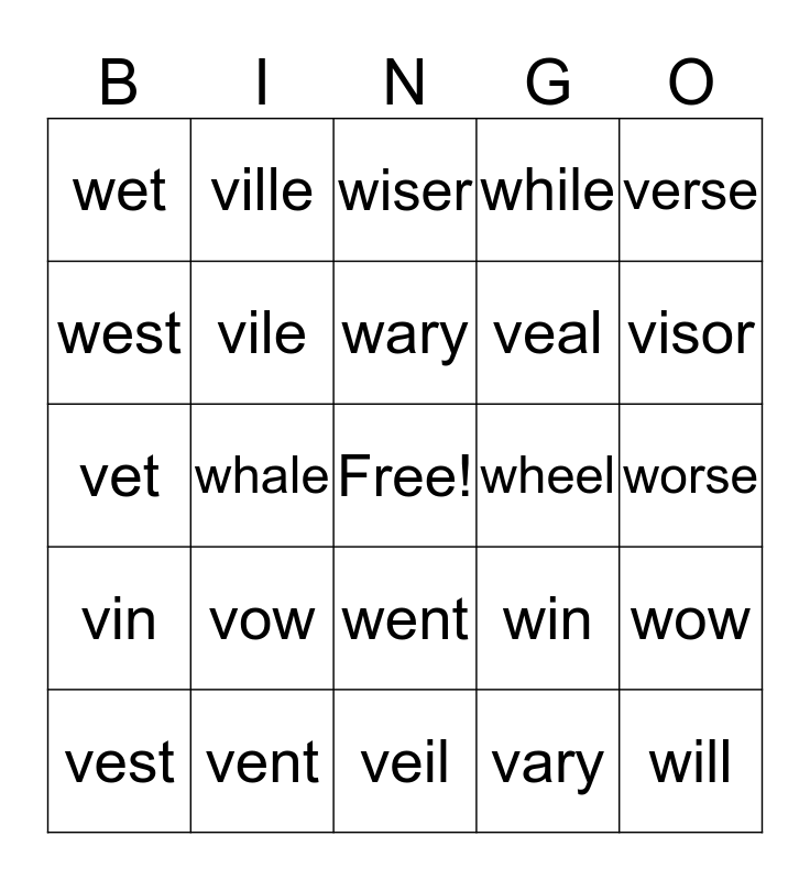 This bingo card has a free space and 24 words: vow, vent, wary, vest, verse, wet, west, ville, wheel, went, veal, vet, win, wow, vile, vary, worse, wiser, visor, whale, will, vin, while and veil.