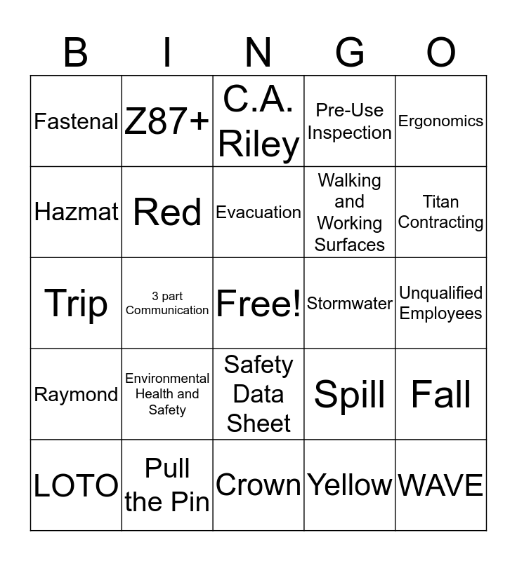 This bingo card has a free space and 24 words: Environmental Health and Safety, Pull the Pin, Evacuation, LOTO, Ergonomics, Fastenal, Hazmat, Z87+, Stormwater, Safety Data Sheet, Walking and Working Surfaces, Trip, Spill, Fall, Red, Yellow, Unqualified Employees, C.A. Riley, Titan Contracting, 3 part Communication, WAVE, Raymond, Pre-Use Inspection and Crown.