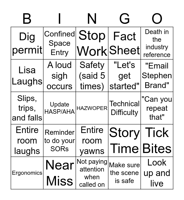 This bingo card has a free space and 24 words: Reminder to do your SORs, Near Miss, Safety (said 5 times), Ergonomics, Death in the industry reference, Dig permit, Lisa Laughs, Confined Space Entry, Technical Difficulty, Entire room yawns, "Let's get started", Slips, trips, and falls, Story Time, Tick Bites, A loud sigh occurs, Make sure the scene is safe, "Can you repeat that", Stop Work, "Email Stephen Brand", Update HASP/AHA, Look up and live, Entire room laughs, Fact Sheet and Not paying attention when called on.