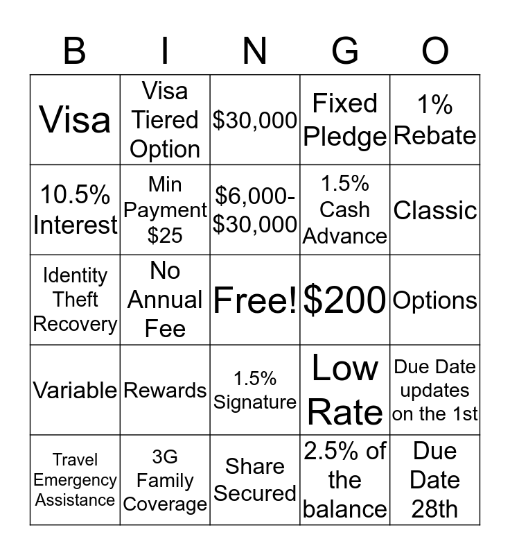 This bingo card has a free space and 29 words: Travel Emergency Assistance, AFCU is BEST!!, No Annual Fee, Limit, Visa, $30,000, Min Payment $25, Rewards, $200, 3G Family Coverage, Options, Due Date 28th, Share Secured, 2.5% of the balance, Classic, Platinum, 1.5% Signature, Variable, 1% Rebate, Identity Theft Recovery, Low Rate, No Balance Transfer Fees, 1.5% Cash Advance, 10.5% Interest, Fixed Pledge, Visa Tiered Option, Due Date updates on the 1st, $6,000- $30,000 and Points.