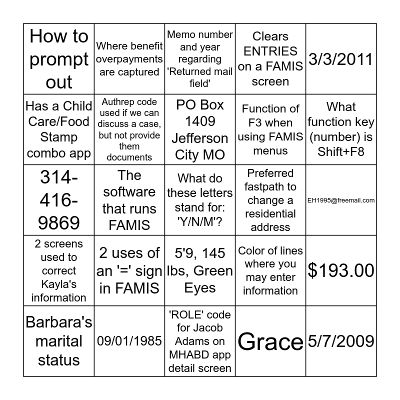 This bingo card has 72 words: What CD1P stands for, Where benefit overpayments are captured, The software that runs FAMIS, Screen used to change your printer, Enlarges/Reduces help windows, Function key to create a new comment, Clears ENTRIES on a FAMIS screen, Consists of a program code, DCN, subprogram, sequence number, Function of F3 when using FAMIS menus, Key that takes you directly to the command line in FAMIS, Barbara's marital status, Barbara's daughter, What function key (number) is Shift+F8, How to prompt out, $260.00, 314-416-9869, Color of lines where you may enter information, 3/3/2011, What applicants have the option to opt out of, EH1995@freemail.com, 2 uses of an '=' sign in FAMIS, What do these letters stand for: 'Y/N/M'?, $193.00, $1361.80, $64.01, Month of birth and 1st letter of last name, Food Stamp change report form number, Claimant action notice form number, $980.34, $353.00, 09/01/1985, 573-879-0055, What to do when you think an address override is necessary?, 1719 S Ridge Dr, Grace, Marianne Willoughby's marital status, Mr. Willoughby's email address, Type of interview FSINTRVW defaults to, Has a Child Care/Food Stamp combo app, Twins, 5'9, 145 lbs, Green Eyes, 5/7/2009, Function key that takes customer from common area back to FAMIS, Keisha Moon's 'ROLE' code for Child Care app, Where Keisha's FS & CC apps were received and registered, 2 screens used to correct Kayla's information, Screen an ES uses to pick up an app in the controlled flow, Other than FAMIS, system where ALL customer contact is recorded, System where documents can be located and viewed, PO Box 1414, Jefferson City MO, 2/10/1993, Last address Sally moved to, Who starts out living at 3308 Devon?, Preferred fastpath to change a residential address, Screen to record phone numbers and email addresses, Function Key for PRSNDTL from SCMBR, Memo number and year regarding 'Returned mail field', PO Box 1409 Jefferson City MO, 2136 William Street, Cape Girardeau MO, Instance when we must not require a customer to provide a residential address, SF, What field is marked with a 'Y' on PRSNDTL if a Safe at Home customer?, Has an MHABD/FS combo app, 'ROLE' code for Jacob Adams on MHABD app detail screen, Noah, Judy Adams, Authrep code used if we can discuss a case, but not provide them documents, Code used in combination with RLS, Authrep form number, Who owns a Dodge Ram?, Jaxon's cousin and What ID verification is used when registering an add a person?.