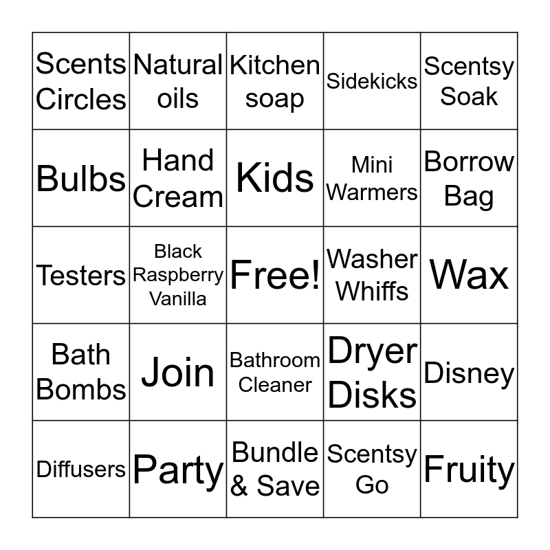This bingo card has a free space and 34 words: Scentsy, Scentsy Go, Scentsy Buddys, Buddy Clips, Bath Bombs, Hand Cream, Scentsy Soak, Diffusers, Natural oils, Oils, Kids, Kitchen soap, Consultant, Bring Back My Bar, Washer Whiffs, Borrow Bag, Party, Testers, Join, Dryer Disks, Bathroom Cleaner, Samples, Scents Circles, Wax, Bundle & Save, Fruity, Sidekicks, Warmers, Mini Warmers, Bulbs, Clearance, Black Raspberry Vanilla, Disney and Host.