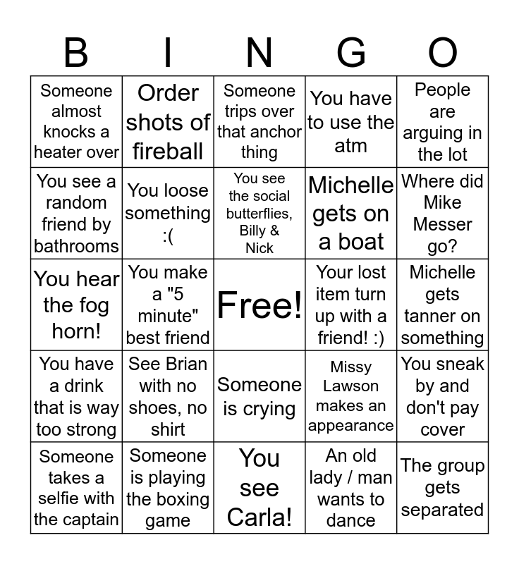 This bingo card has a free space and 24 words: See Brian with no shoes, no shirt, Someone is playing the boxing game, You see the social butterflies, Billy & Nick, Someone takes a selfie with the captain, People are arguing in the lot, Someone almost knocks a heater over, You see a random friend by bathrooms, Order shots of fireball, Your lost item turn up with a friend! :), Someone is crying, Michelle gets on a boat, You hear the fog horn!, Missy Lawson makes an appearance, You sneak by and don't pay cover, You loose something :(, An old lady / man wants to dance, Michelle gets tanner on something, Someone trips over that anchor thing, Where did Mike Messer go?, You make a "5 minute" best friend, The group gets separated, You have a drink that is way too strong, You have to use the atm and You see Carla!.