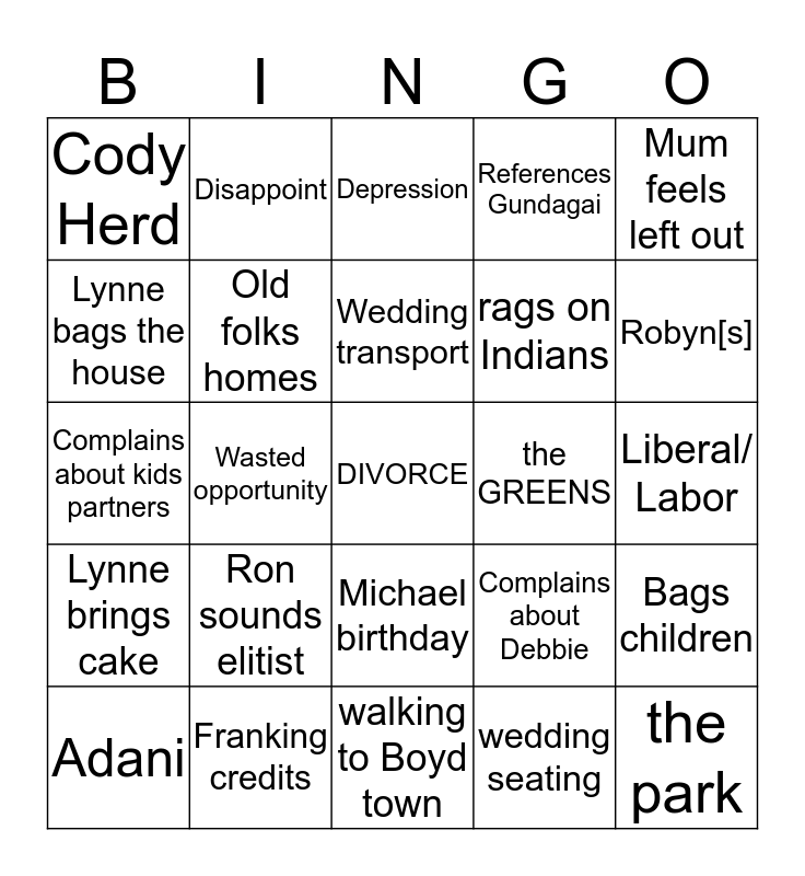 This bingo card has a free space and 29 words: Adani, Gay, Wasted opportunity, Cousins attending, Cody Herd, Depression, Old folks homes, Ron sounds elitist, the GREENS, Franking credits, Liberal/ Labor, the park, walking to Boyd town, wedding seating, Robyn[s], Ross says something awkward, Michael birthday, Lynne brings cake, Mum feels left out, Complains about kids partners, Complains about Debbie, Newsagent, rags on Indians, Lynne bags the house, References Gundagai, Disappoint, Bags children, Wedding transport and Land Tax.