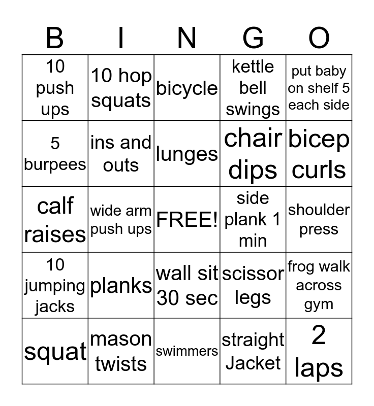 This bingo card has a free space and 24 words: planks, mason twists, lunges, squat, put baby on shelf 5 each side, 10 push ups, 5 burpees, 10 hop squats, side plank 1 min, wall sit 30 sec, chair dips, calf raises, scissor legs, frog walk across gym, ins and outs, straight Jacket, shoulder press, bicycle, bicep curls, wide arm push ups, 2 laps, 10 jumping jacks, kettle bell swings and swimmers.