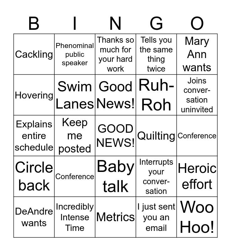 This bingo card has a free space and 24 words: Conference, Incredibly Intense Time, Good News!, DeAndre wants, Mary Ann wants, Cackling, Hovering, Phenominal public speaker, Quilting, Baby talk, Ruh-Roh, Explains entire schedule, Interrupts your conver-sation, Heroic effort, Swim Lanes, I just sent you an email, Conference, Thanks so much for your hard work, Joins conver-sation uninvited, Keep me posted, Woo Hoo!, Circle back, Tells you the same thing twice and Metrics.