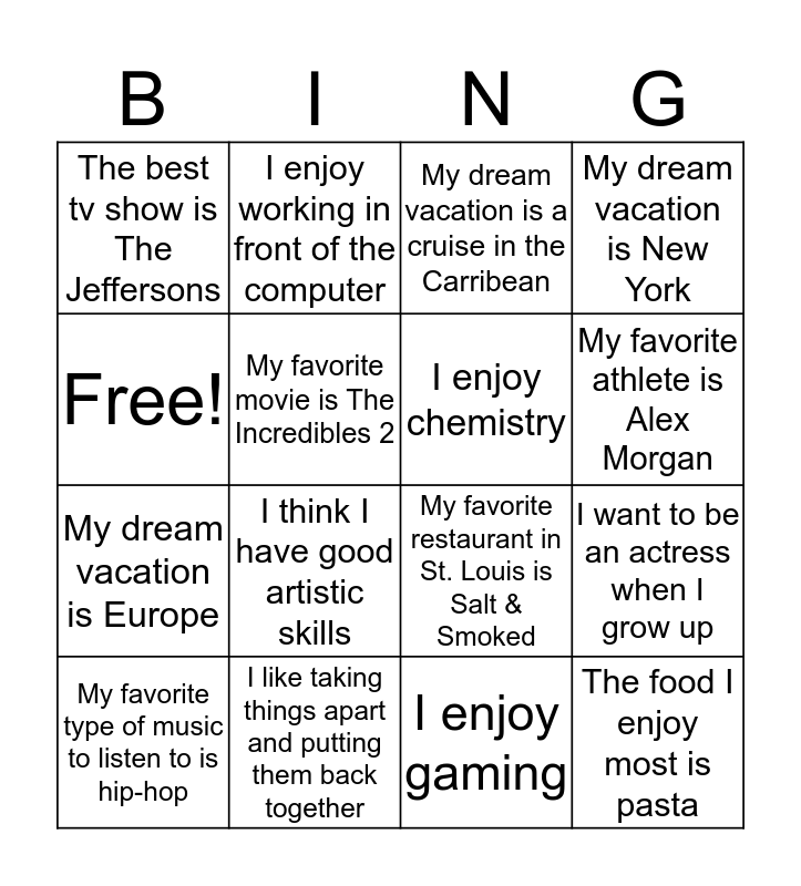 This bingo card has 16 words: I like taking things apart and putting them back together, I want to be an actress when I grow up, My dream vacation is a cruise in the Carribean, The best tv show is The Jeffersons, My dream vacation is Europe, I enjoy working in front of the computer, My favorite restaurant in St. Louis is Salt & Smoked, I enjoy gaming, Free!, My favorite movie is The Incredibles 2, My favorite type of music to listen to is hip-hop, My dream vacation is New York, I think I have good artistic skills, My favorite athlete is Alex Morgan, I enjoy chemistry and The food I enjoy most is pasta.