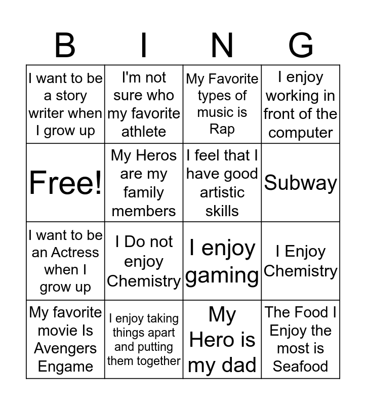 This bingo card has 16 words: I enjoy taking things apart and putting them together, I Enjoy Chemistry, My Favorite types of music is Rap, I want to be a story writer when I grow up, I want to be an Actress when I grow up, I'm not sure who my favorite athlete, I enjoy gaming, My Hero is my dad, Free!, My Heros are my family members, My favorite movie Is Avengers Engame, I enjoy working in front of the computer, I Do not enjoy Chemistry, Subway, I feel that I have good artistic skills and The Food I Enjoy the most is Seafood.