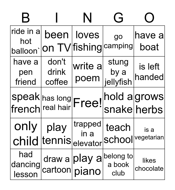 This bingo card has a free space and 24 words: play tennis, draw a cartoon, write a poem, had dancing lesson, have a boat, ride in a hot balloon`, have a pen friend, been on TV, hold a snake, trapped in a elevator, stung by a jellyfish, speak french, teach school, is a vegetarian, don't drink coffee, belong to a book club, grows herbs, loves fishing, is left handed, has long real hair, likes chocolate, only child, go camping and play a piano.
