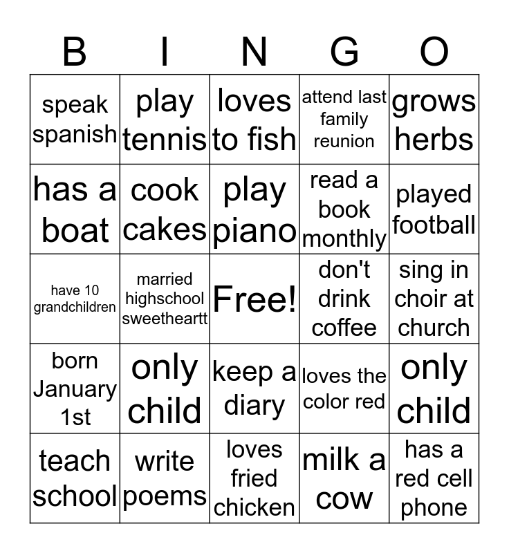 This bingo card has a free space and 24 words: only child, write poems, play piano, teach school, grows herbs, speak spanish, has a boat, play tennis, don't drink coffee, keep a diary, read a book monthly, have 10 grandchildren, loves the color red, only child, cook cakes, milk a cow, sing in choir at church, loves to fish, played football, married highschool sweetheartt, has a red cell phone, born January 1st, attend last family reunion and loves fried chicken.