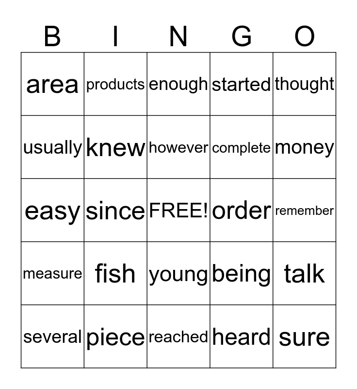 This bingo card has a free space and 24 words: fish, piece, however, several, thought, area, usually, products, order, young, complete, easy, being, talk, knew, heard, remember, enough, money, since, sure, measure, started and reached.