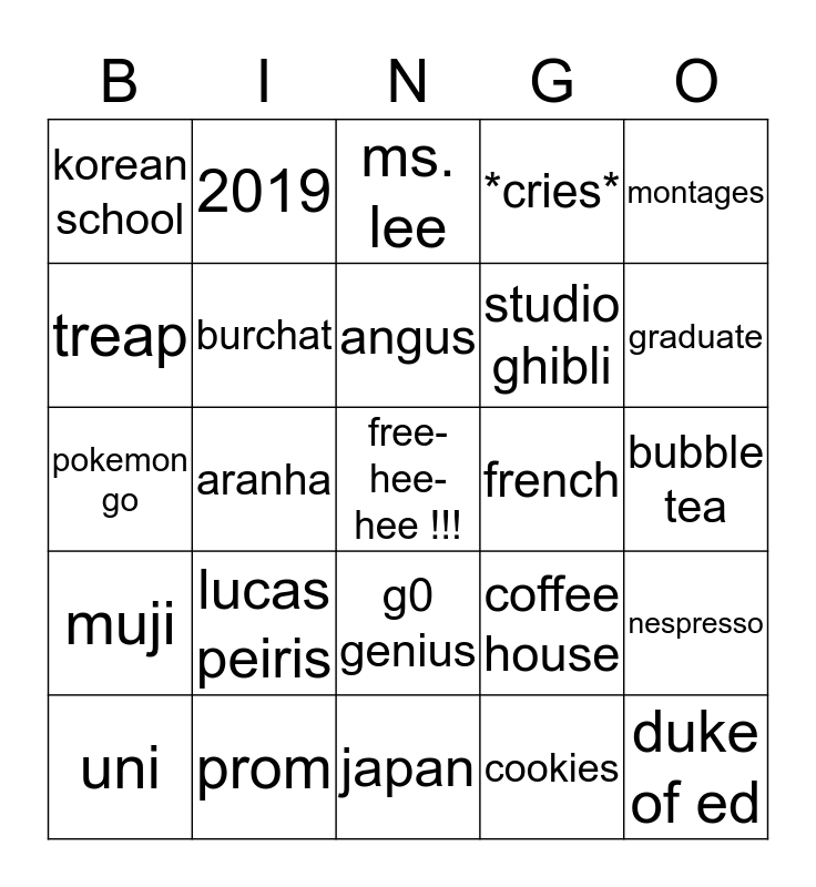 This bingo card has a free space and 34 words: laptop, cookies, mints, hoffman, muji, burchat, montages, uni, 2019, zepeto, angus, ms. lee, cochetto, bucket lists, french, graduate, prom, pokemon go, lucas peiris, coffee house, g0 genius, semi, korean school, bubble tea, japan, duke of ed, *cries*, summer !!, studio ghibli, treap, didonato, aranha, nespresso and spare.