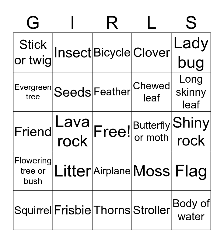 This bingo card has a free space and 39 words: Leaf with jagged edges, White flower, Red or purple leaves, Seeds, Squirrel, Airplane, Feather, Mushroom, Lady bug, Flowering tree or bush, Lava rock, Clover, Body of water, Shiny rock, Butterfly or moth, Litter, Ant hill, Stick or twig, Bird nest, Moss, Evergreen tree, Thorns, Chewed leaf, Long skinny leaf, Spider web, Flat rock, Flying bird, Mud, Fallen branch, Insect, Spider, Something smooth, Bicycle, Frisbie, Stroller, Sprinkler, Flag, Friend and White car.