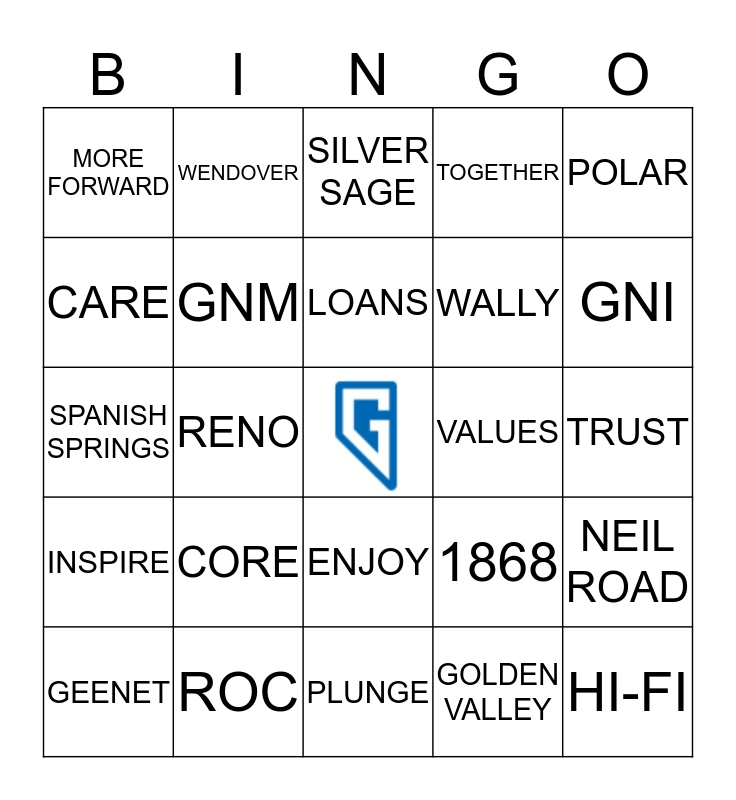 This bingo card has a free space and 39 words: GNCU, RECROOM, ACES, GNM, GEENET, ENJOY, LOANS, EXPERIENCE, POLAR, INSPIRE, RENO, TOGETHER, HI-FI, TRUST, VALUES, CORE, GCL, MORE FORWARD, BE BRIGHT, 1868, CARE, PLUNGE, WALLY, GNI, PAYCOM, VACATION, Greater, Nevada, ELKO, WENDOVER, MINDEN, EAGLE, SILVER SAGE, ROC, GOLDEN VALLEY, DAYTON, NEIL ROAD, SPANISH SPRINGS and ELKO.
