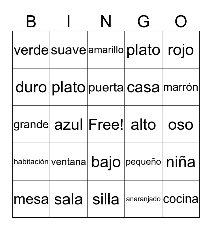 This bingo card has a free space and 25 words: ventana, silla, puerta, mesa, rojo, verde, duro, suave, alto, bajo, casa, grande, pequeño, niña, plato, cama, oso, amarillo, marrón, azul, cocina, sala, habitación, plato and anaranjado.