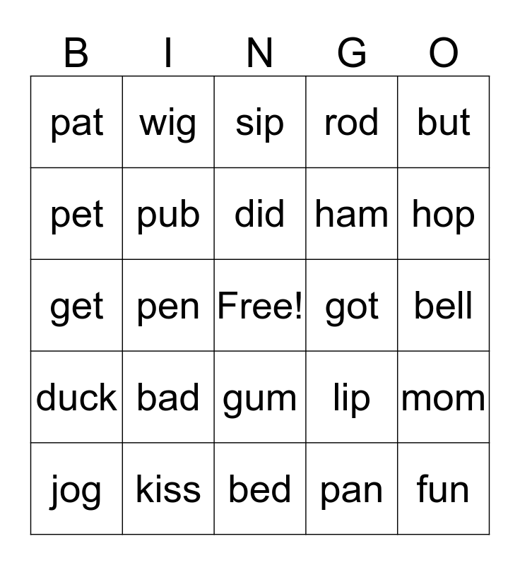 This bingo card has a free space and 25 words: bad, bed, did, jog, but, pat, pet, wig, got, gum, ham, get, lip, mom, pub, can, bell, sip, hop, pen, fun, kiss, duck, rod and pan.