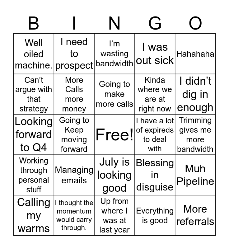 This bingo card has a free space and 26 words: July is looking good, Everything is good, Going to make more calls, I thought the momentum would carry through., Hahahaha, Well oiled machine., Can’t argue with that strategy, I need to prospect, Trimming gives me more bandwidth, Blessing in disguise, Kinda where we are at right now, Looking forward to Q4, Muh Pipeline, Calling my warms, Going to Keep moving forward, I’m on track, I was out sick, Working through personal stuff, I’m wasting bandwidth, More referrals, I didn’t dig in enough, Up from where I was at last year, I have a lot of expireds to deal with, Managing emails, More Calls more money and I need to be more focused.