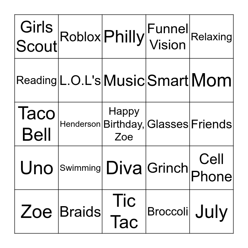This bingo card has a free space and 29 words: Zoe, Taylor, Henderson, Karate, Girls Scout, Philly, L.O.L's, Swimming, Glasses, Braids, Friends, July, Tic Tac, Broccoli, Mom, Dad, Diva, Uno, Relaxing, Taco Bell, Grinch, Painting, Smart, Reading, Funnel Vision, Roblox, Cell Phone, Music and Crazy.
