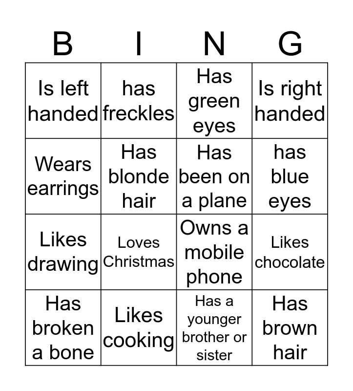This bingo card has 24 words: A cat lover, Born in March, has blue eyes, Someone who can whistle, Wears earrings, Is left handed, Has blonde hair, has freckles, Likes cooking, Has caught a fish, Likes drawing, Owns a mobile phone, Likes tuna, Has a dog, Has been on a plane, Wears glasses, Has a younger brother or sister, Has green eyes, Loves Christmas, Likes chocolate, Has broken a bone, Has brown hair, Is right handed and Loves horses.