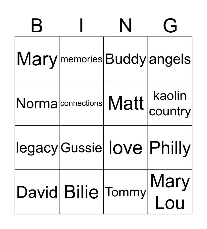 This bingo card has 30 words: Free!, Georgia, Philly, Maryland, Mary, Buddy, Matt, Bobby, Bilie, Charles, Tommy, David, Rat-Tan, Lonnie, Gussie, Winnie, Sal, Mary Lou, Geraldine, Norma, love, family, memories, legacy, connections, angels, faith, Sandersville, kaolin country and Elderite.