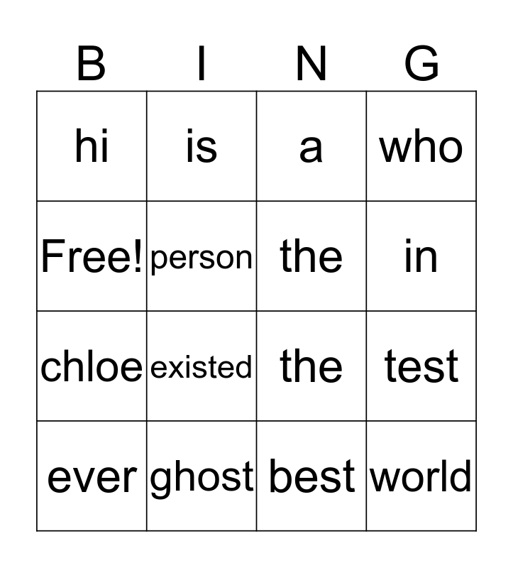 This bingo card has 16 words: ghost, test, a, hi, chloe, is, the, best, Free!, person, ever, who, existed, in, the and world.
