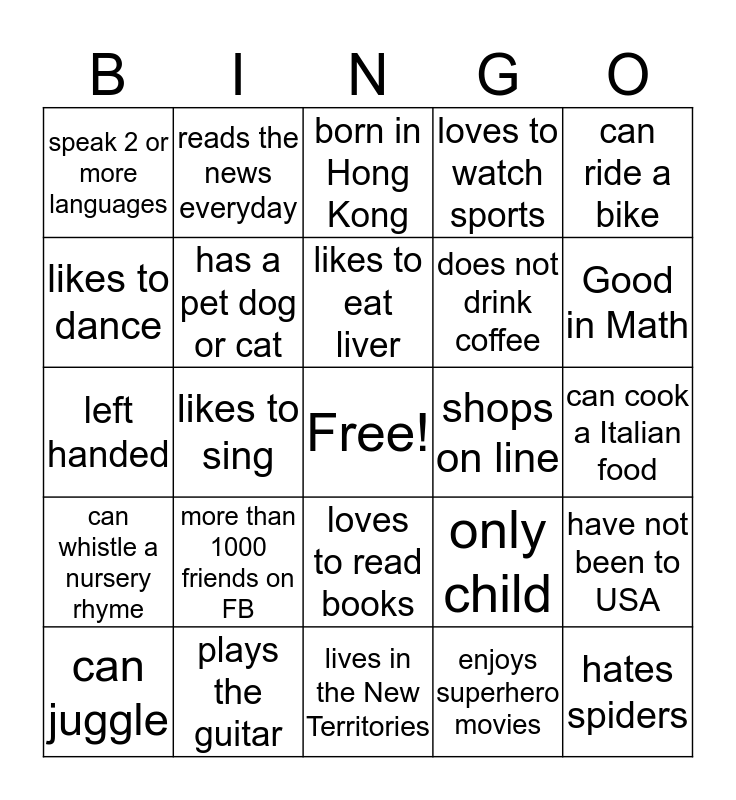 This bingo card has a free space and 24 words: more than 1000 friends on FB, plays the guitar, likes to eat liver, can juggle, can ride a bike, speak 2 or more languages, likes to dance, reads the news everyday, shops on line, loves to read books, does not drink coffee, left handed, only child, have not been to USA, has a pet dog or cat, enjoys superhero movies, can cook a Italian food, born in Hong Kong, Good in Math, likes to sing, hates spiders, can whistle a nursery rhyme, loves to watch sports and lives in the New Territories.