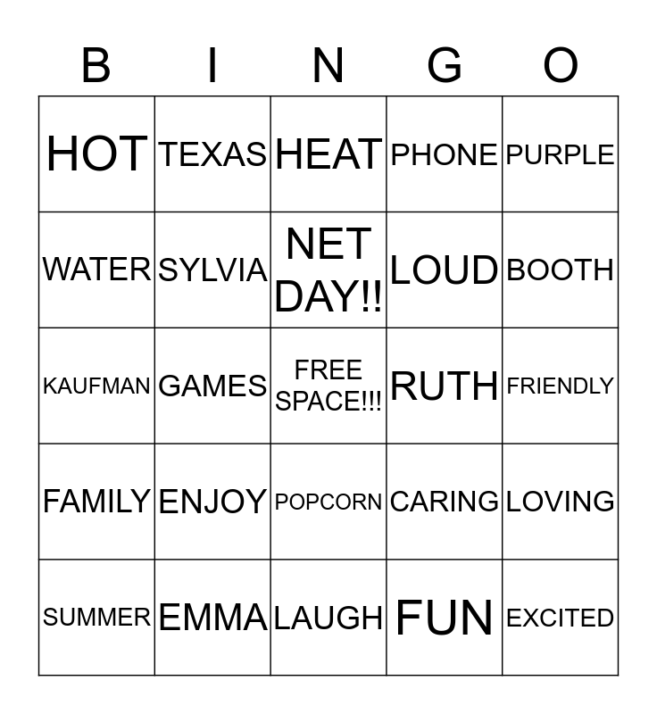 This bingo card has a free space and 29 words: JULY 2019, EMMA, HEAT, GERT, PURPLE, HOT, SYLVIA, NET DAY!!, RUTH, LOVING, SUMMER, GAMES, FUN, EXCITED, KAUFMAN, HELPING, LAUGH, CARING, BOOTH, FAMILY, ENJOY, WEIGHT LOSS, LOUD, FRIENDLY, WATER, TEXAS, POPCORN, PHONE and BILL.