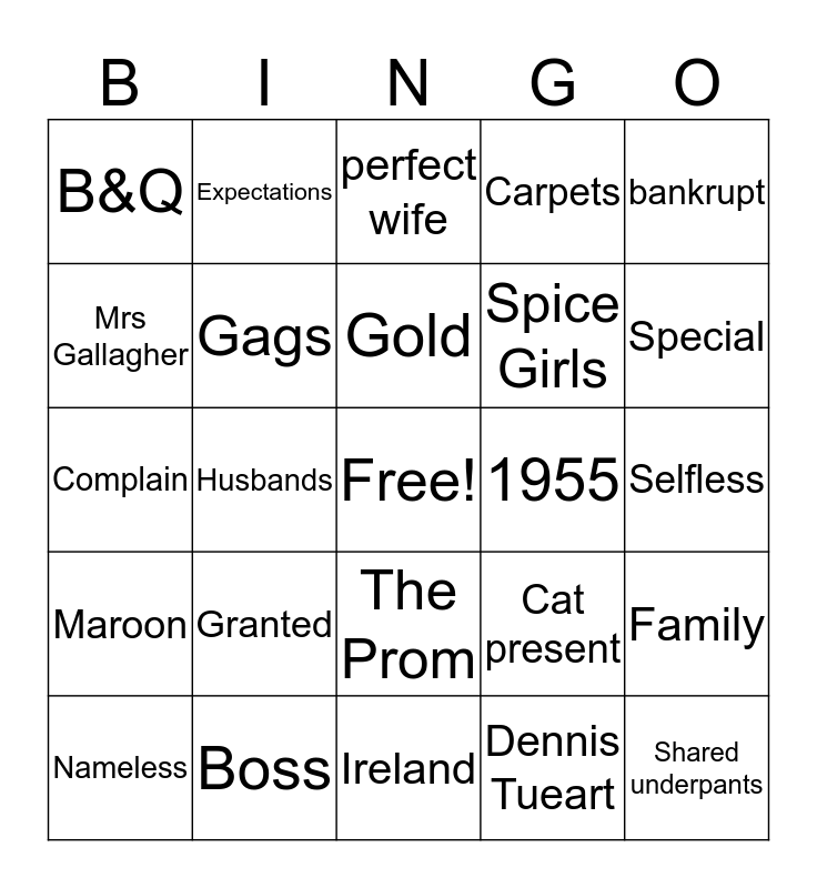 This bingo card has a free space and 34 words: Summer 76, Dennis Tueart, Baby shark, Cocktails, Maroon, Gags, bankrupt, Nameless, Expectations, Willing, Gold, perfect wife, Training, Advice, 1955, Special, Boss, Complain, Granted, Cat present, The Prom, The Parrswood, B&Q, Selfless, Ireland, Shared underpants, Carpets, Mr Thom's, Spice Girls, Mrs Gallagher, Handsome, Husbands, Family and Cheadle Town FC.