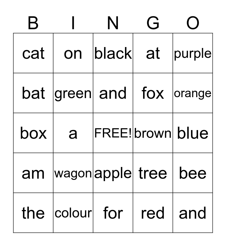 This bingo card has a free space and 24 words: wagon, colour, and, the, purple, cat, bat, on, brown, apple, fox, box, tree, bee, green, red, blue, black, orange, a, and, am, at and for.