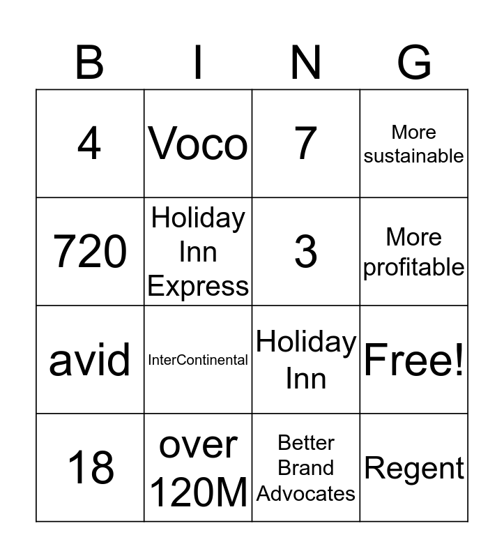 This bingo card has 20 words: Free!, 630, 7, $2.2M, 18, 720, over 120M, 4, avid, Voco, InterContinental, Holiday Inn, Holiday Inn Express, Regent, 3, $1.2M, More profitable, More sustainable, Better Brand Advocates and More Marketable.