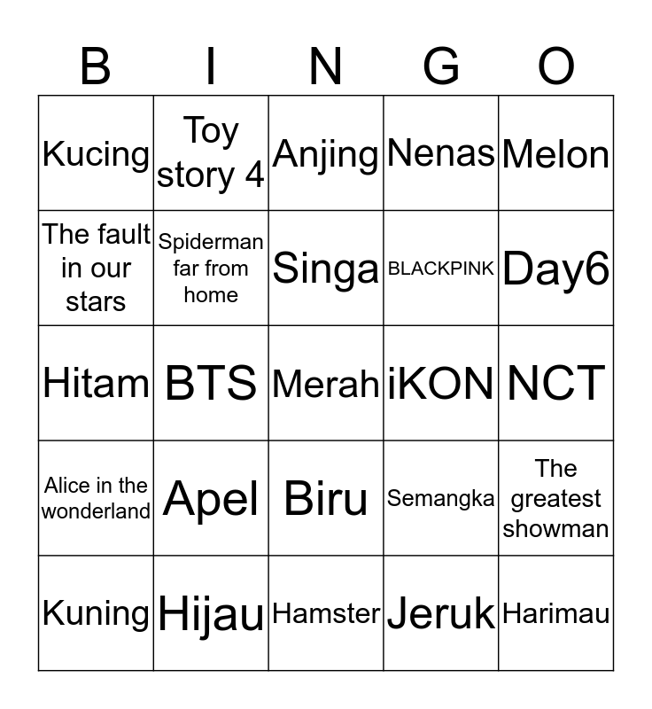 This bingo card has a free space and 24 words: Apel, Hijau, Singa, Kuning, Melon, Kucing, The fault in our stars, Toy story 4, iKON, Biru, BLACKPINK, Hitam, Semangka, The greatest showman, Spiderman far from home, Jeruk, NCT, Anjing, Day6, BTS, Harimau, Alice in the wonderland, Nenas and Hamster.