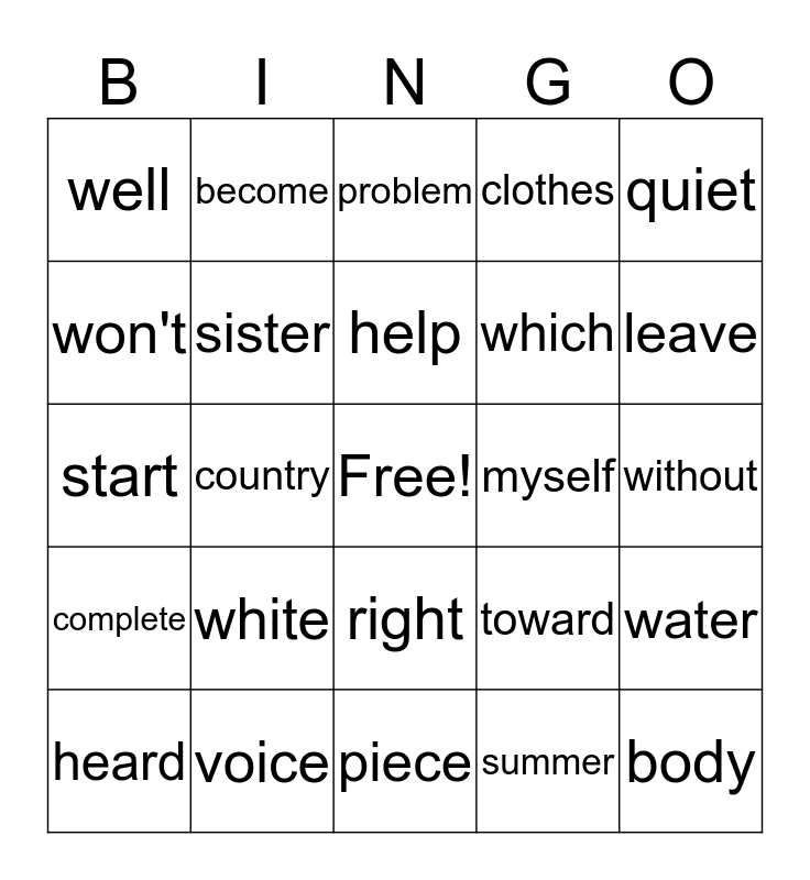 This bingo card has a free space and 25 words: white, piece, help, heard, quiet, well, won't, become, myself, right, which, start, toward, water, sister, mountain, without, problem, leave, country, body, voice, complete, clothes and summer.
