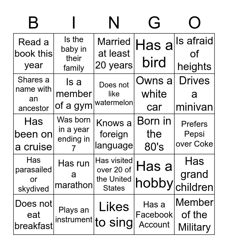 This bingo card has 30 words: Plays an instrument, Is left handed, Was born in a year ending in 7, Has 3 siblings, Read a book this year, Married at least 20 years, Is a member of a gym, Has visited over 20 of the United States, Born in the 80's, Likes to sing, Prefers Pepsi over Coke, Knows a foreign language, Has a Facebook Account, Member of the Military, Drives a minivan, Owns a dog, Has a hobby, Has parasailed or skydived, Has run a marathon, Is afraid of heights, Has been on a cruise, Is over 6 ft tall, Is the baby in their family, Owns a white car, Shares a name with an ancestor, Has a bird, Has grand children, Does not eat breakfast, Does not like watermelon and Can't swim.