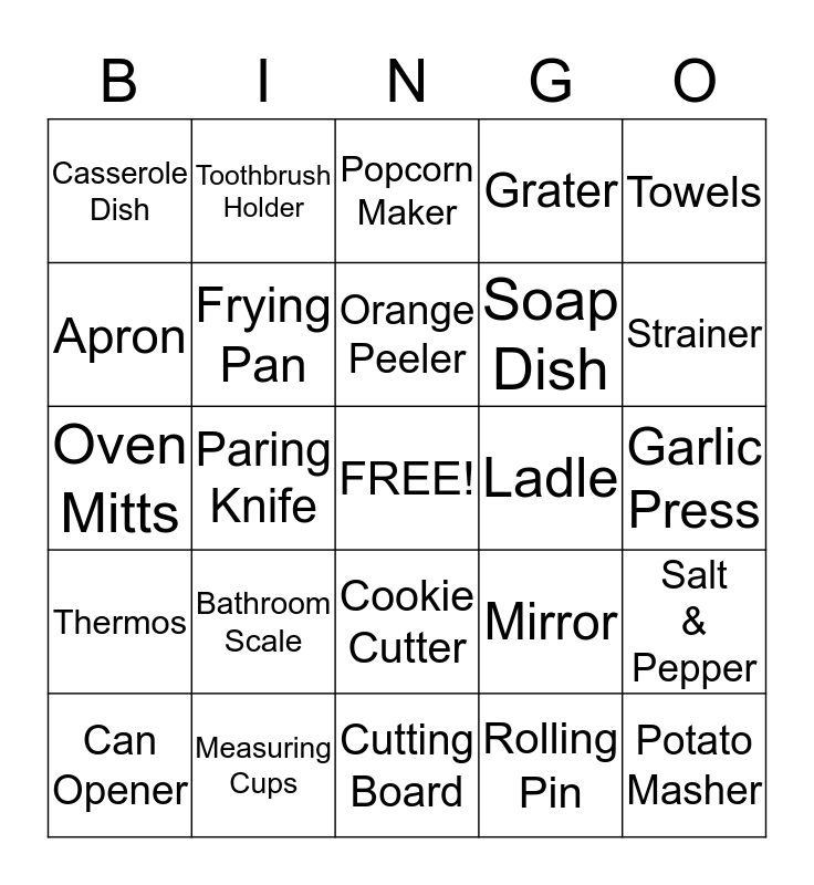 This bingo card has a free space and 24 words: Bathroom Scale, Measuring Cups, Orange Peeler, Can Opener, Towels, Casserole Dish, Apron, Toothbrush Holder, Ladle, Cookie Cutter, Soap Dish, Oven Mitts, Mirror, Salt & Pepper, Frying Pan, Rolling Pin, Garlic Press, Popcorn Maker, Strainer, Paring Knife, Potato Masher, Thermos, Grater and Cutting Board.