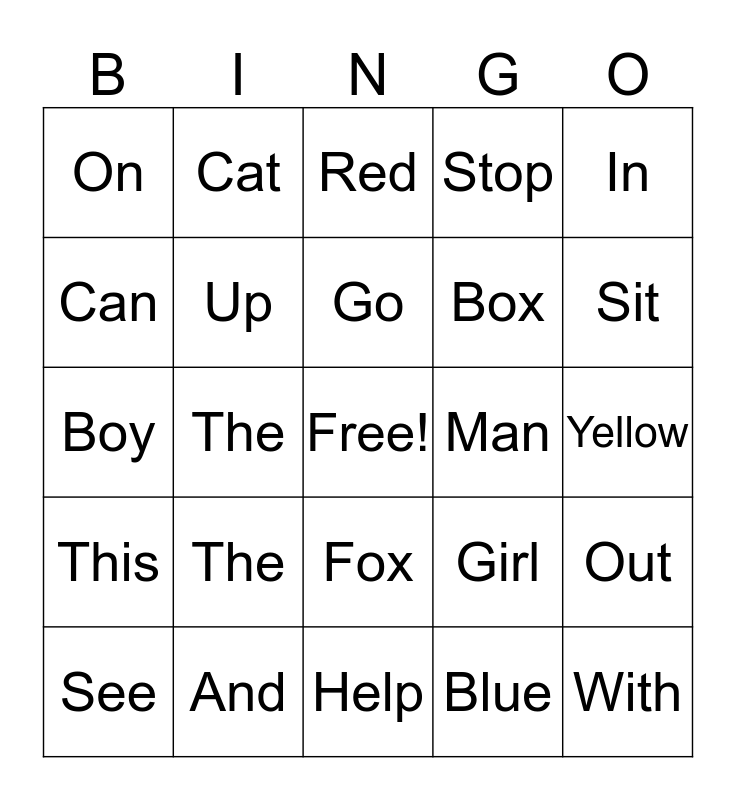 This bingo card has a free space and 24 words: The, And, Go, See, In, On, Can, Cat, Man, Fox, Box, Boy, Girl, Out, Up, Blue, Yellow, Red, Sit, The, With, This, Stop and Help.