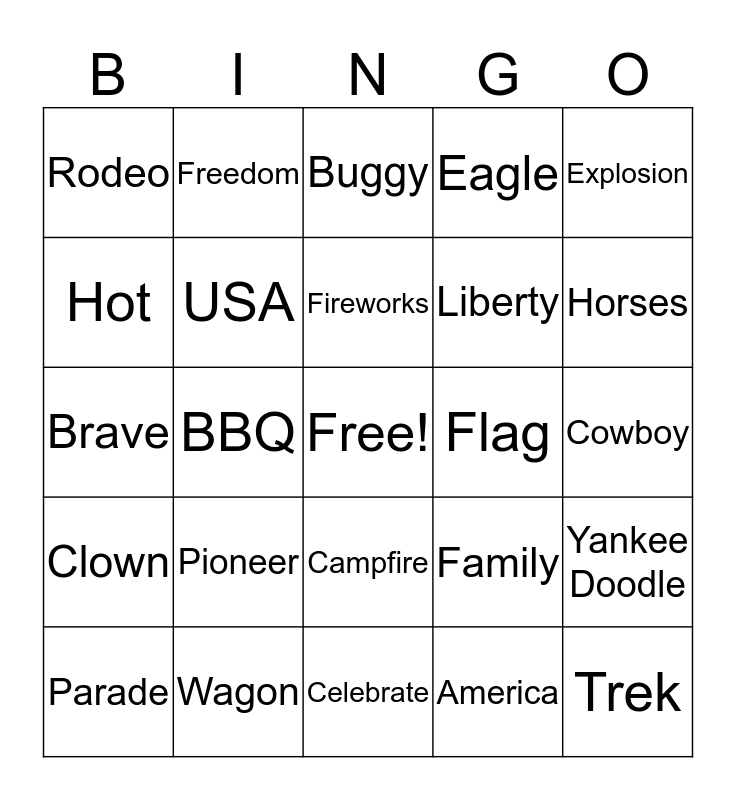This bingo card has a free space and 24 words: Pioneer, Wagon, Fireworks, Parade, Explosion, Rodeo, Hot, Freedom, Flag, Campfire, Liberty, Brave, Family, Yankee Doodle, USA, America, Cowboy, Buggy, Horses, BBQ, Trek, Clown, Eagle and Celebrate.