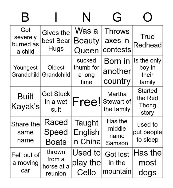 This bingo card has a free space and 29 words: Fell out of a moving car, Dug an Outhouse, Got Stuck in a wet suit, Ate a worm, Got severely burned as a child, Was a Beauty Queen, Oldest Grandchild, Raced Speed Boats, Martha Stewart of the family, thrown from a horse at a reunion, Started the Red Thong story, Has the most dogs, Used to play the Cello, Got lost in the mountain, Is the only boy in their family, Biggest Baby, Taught English in China, Share the same name, True Redhead, Built Kayak's, Has the middle name Samson, Sealed in the Logan Temple, Born in another country, Youngest Grandchild, Throws axes in contests, Gives the best Bear Hugs, used to put people to sleep, sucked thumb for a long time and Blew a hole in a girls new coat.