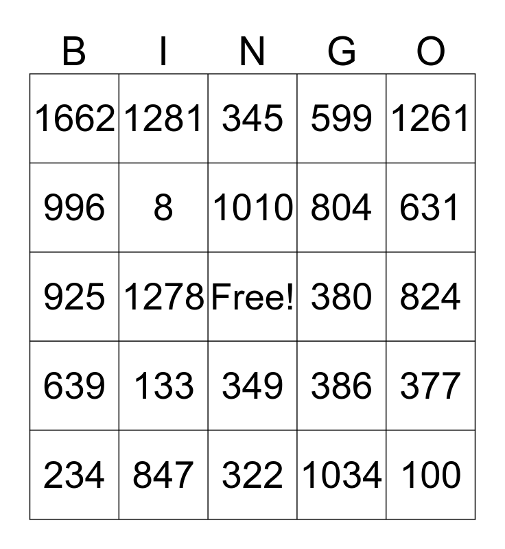 This bingo card has a free space and 50 words: 1641, 100, 553, 322, 133, 794, 1281, 664, 996, 77, 8, 599, 377, 386, 106, 12, 1010, 380, 263, 1261, 1278, 1034, 1662, 804, 1151, 1281, 631, 186, 345, 349, 175, 44, 1442, 723, 847, 801, 138, 225, 1281, 824, 1257, 600, 1283, 284, 234, 925, 1414, 715, 639 and 1476.