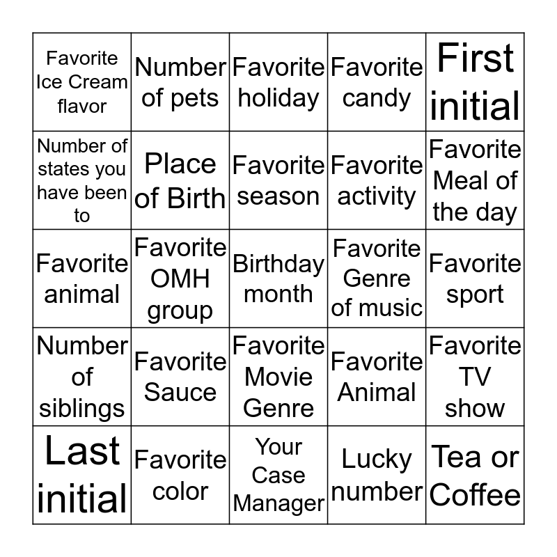 This bingo card has 25 words: Number of siblings, Favorite color, Birthday month, Lucky number, First initial, Favorite Ice Cream flavor, Number of pets, Favorite holiday, Favorite Genre of music, Favorite TV show, Number of states you have been to, Place of Birth, Your Case Manager, Favorite Animal, Favorite Meal of the day, Last initial, Favorite OMH group, Favorite season, Favorite activity, Favorite sport, Favorite animal, Favorite Sauce, Favorite Movie Genre, Favorite candy and Tea or Coffee.