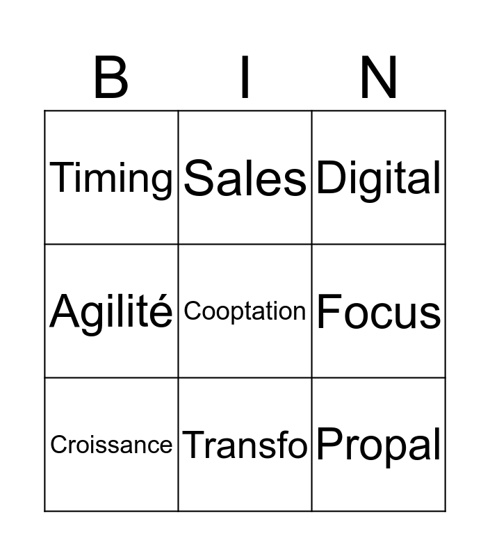 This bingo card has a free space and 8 words: Focus, Digital, Sales, Croissance, Timing, Propal, Agilité and Transfo.