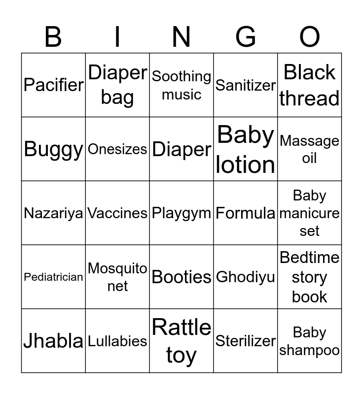 This bingo card has 35 words: Bottle, Crib, Romper, Onesizes, Booties, Sanitizer, Buggy, Playpen, Diaper, Socks, Nazariya, Black thread, Mittens, Toys, Pacifier, Formula, Sterilizer, Vaccines, Pediatrician, Playgym, Ghodiyu, Jhabla, Bedtime story book, Lullabies, Soothing music, Massage oil, Baby shampoo, Baby soap, Baby lotion, Baby manicure set, Kala teeka, Rattle toy, Mosquito net, Diaper bag and Changing sheet.
