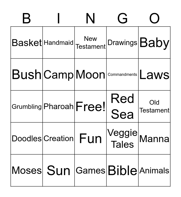 This bingo card has a free space and 24 words: Creation, Sun, Moon, Moses, Baby, Basket, Bush, Handmaid, Red Sea, Fun, Commandments, Grumbling, Veggie Tales, Manna, Camp, Bible, Old Testament, New Testament, Laws, Pharoah, Animals, Doodles, Drawings and Games.