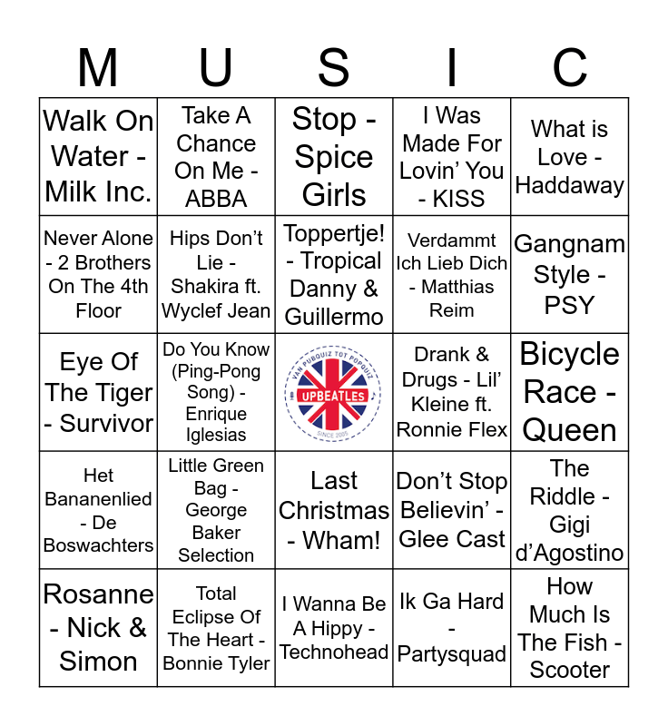 This bingo card has a free space and 24 words: Little Green Bag - George Baker Selection, Total Eclipse Of The Heart - Bonnie Tyler, Toppertje! - Tropical Danny & Guillermo, Rosanne - Nick & Simon, What is Love - Haddaway, Walk On Water - Milk Inc., Never Alone - 2 Brothers On The 4th Floor, Take A Chance On Me - ABBA, Drank & Drugs - Lil’ Kleine ft. Ronnie Flex, Last Christmas - Wham!, Verdammt Ich Lieb Dich - Matthias Reim, Eye Of The Tiger - Survivor, Don’t Stop Believin’ - Glee Cast, The Riddle - Gigi d’Agostino, Hips Don’t Lie - Shakira ft. Wyclef Jean, Ik Ga Hard - Partysquad, Bicycle Race - Queen, Stop - Spice Girls, Gangnam Style - PSY, Do You Know (Ping-Pong Song) - Enrique Iglesias, How Much Is The Fish - Scooter, Het Bananenlied - De Boswachters, I Was Made For Lovin’ You - KISS and I Wanna Be A Hippy - Technohead.